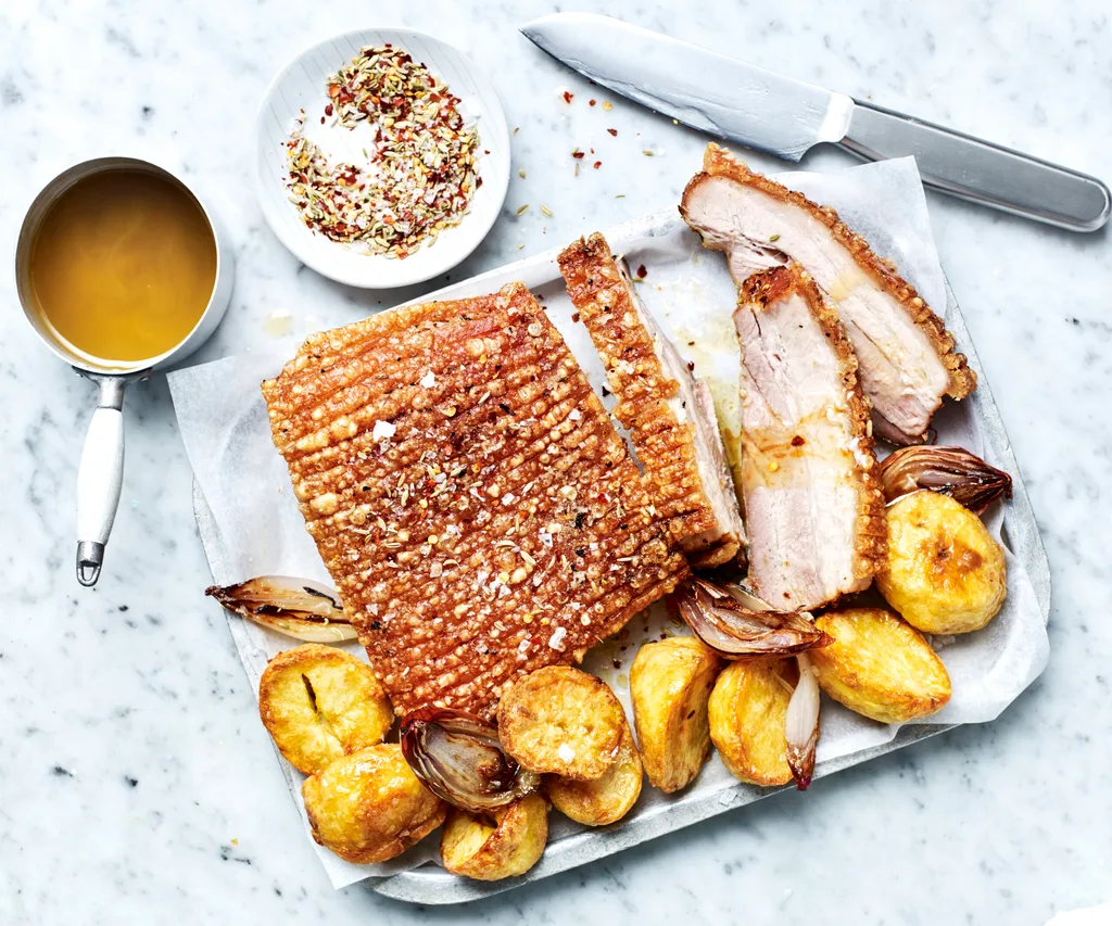 The secret to exceptional crackling is to ensure the pork rind is dry. Use leftover pork for toasties, salads and sandwiches.
