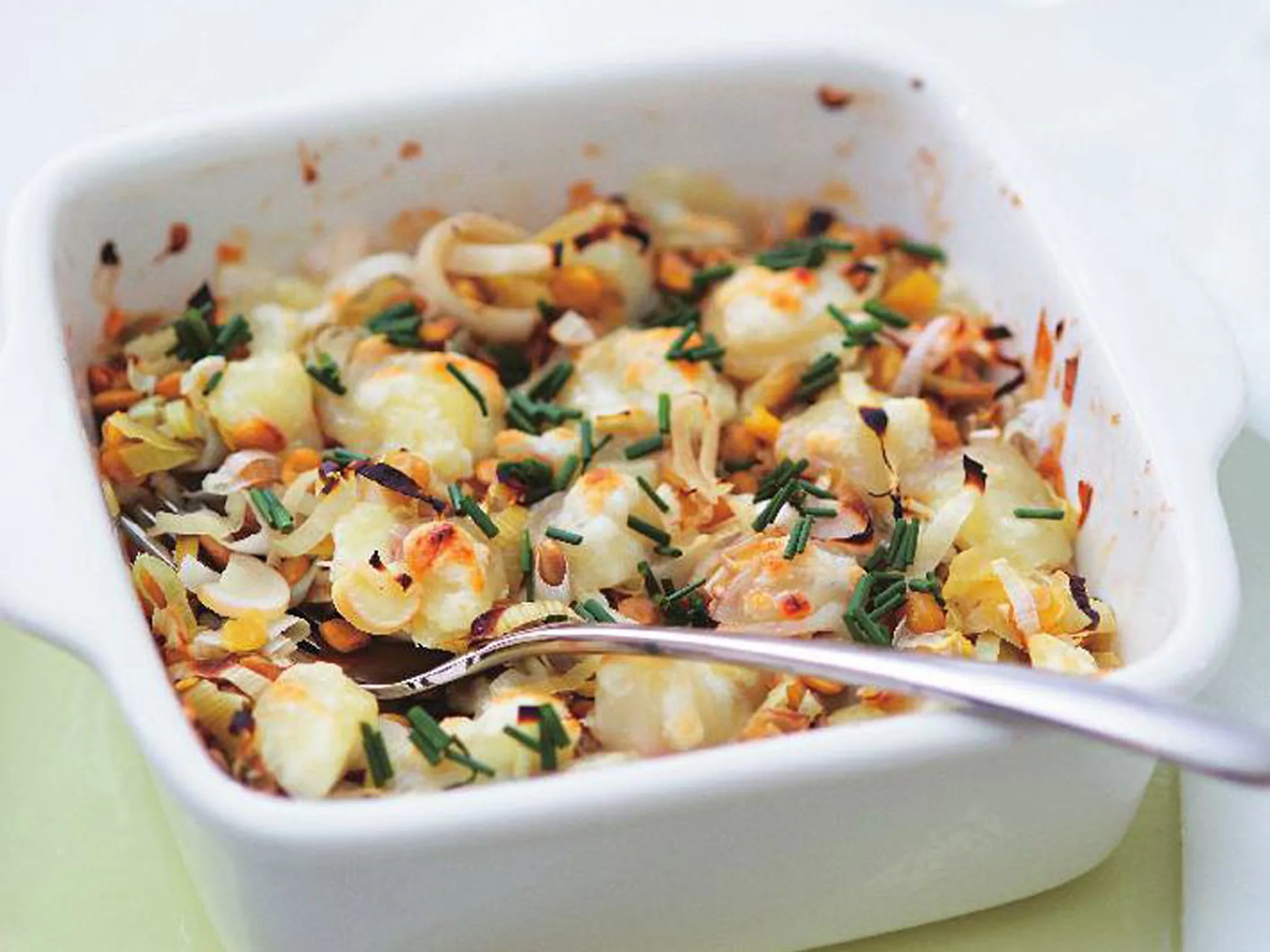 3.Combine lentils, leek, juice, garlic and stock in 3-cup (750ml) ovenproof dish. Bake, covered, about 40 minutes, or until the leek is tender, stirring halfway through cooking.