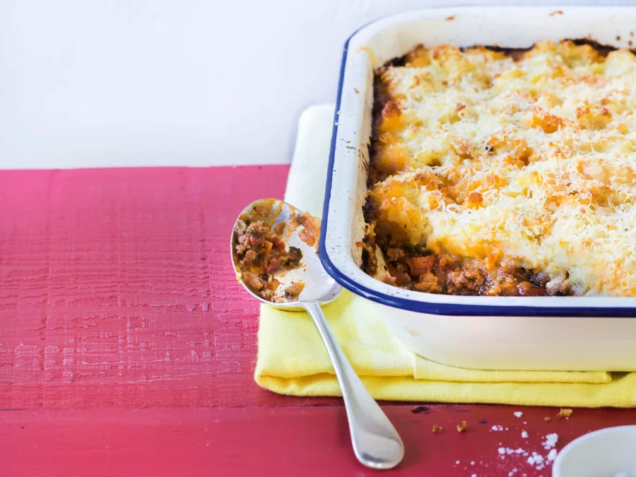 8.Stir mint through the mince filling, then add to your baking dish and smooth out. Spoon potato mash evenly on top.